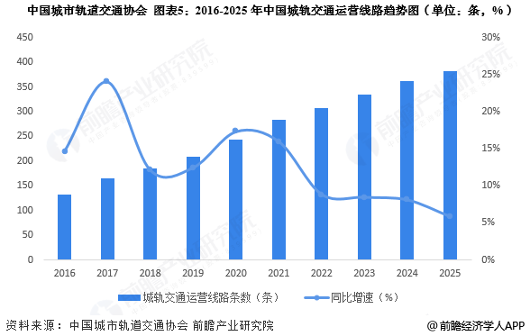 2016-2025年,城轨交通运营线路呈上升趋势。根据中国城市轨道交通协会发布的《2025年中国内地城轨交通线路概况》数据显示,2025年我国新增城市轨道交通运营线路21条,累计达到382条。
