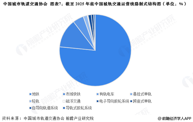 从系统制式来看,截至2025年12月31日,中国内地城轨交通运营线路涵盖了团体标准《城市轨道交通分类》(T/CAMET00001-2020)中全部的10种系统制式,地铁制式仍为主流,占比76.56%,同比基本持平。