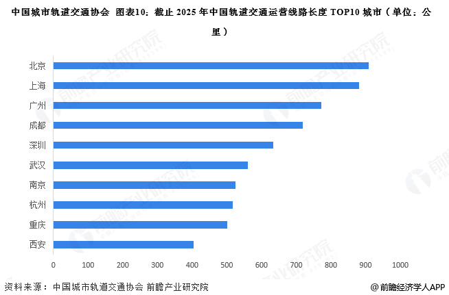 截止2025年12月31日,运营里程排名前十的城市依次为北京、上海、广州、成都、深圳、武汉、南京、杭州、重庆、西安。北京和上海分列全国第一和第二名,城市轨道交通运营里程均在850公里以上。