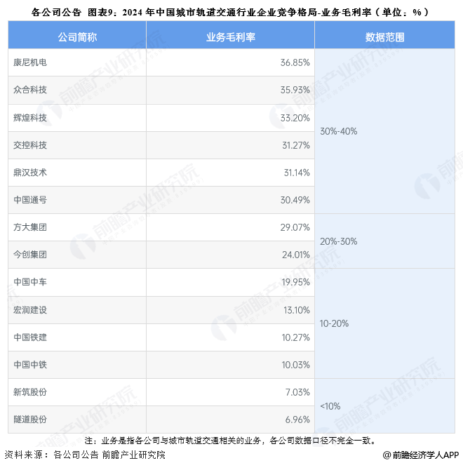 注:业务是指各公司与城市轨道交通相关的业务,各公司数据口径不完全一致。