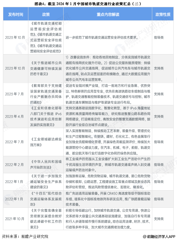 城市轨道交通作为城市公共交通的重要组成部分,也是城市基建的重要组成部分,其发展离不开政策的支持和推动。由于城市轨道交通项目建设周期长、投资大,特别是其设备主要依靠进口,价格昂贵,致使建设造价畸高,地方财力难以承受,制约了城市轨道交通产业的发展,2005年以来,国务院、住房和城乡住建部、交通运输部等多国家部门持续出台推动和完善全国城市轨道交通体系建设相关政策,涉及技术、投资、装备、噪声防治、绿色发展等方面。截至2026年1月,国家层面城市轨道交通行业政策汇总如下。