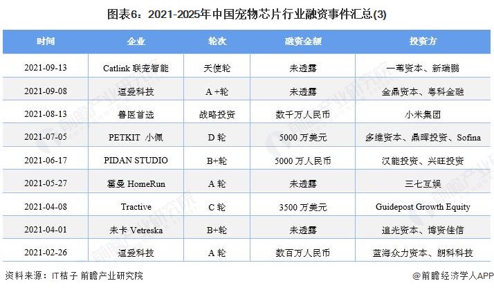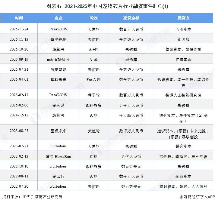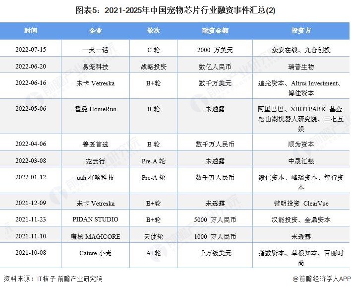 2021-2025年12月中国宠物芯片行业主要的融资事件如下: