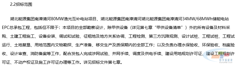 2月28日,湖北能源集团南漳清河80MW渔光互补电站项目、34MW/68MWh储能电站项目EPC总承包招标公告发布,招标人为湖北能源集团汉江能源发展有限公司。