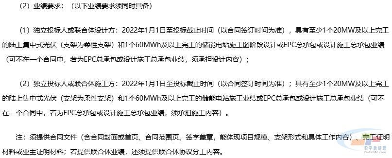 本次招标要求投标人具备良好的经营能力、商业信誉及相应资质;业绩方面需满足:2022 年 1 月 1 日至投标截止时间(以合同签订时间为准),独立投标人或联合体设计方,须具有至少 1 个 20MW 及以上完工的陆上集中式柔性支架光伏和1 个 60MWh 及以上完工的储能电站施工图设计或 EPC 总承包、设计施工总承包业绩(须承担设计内容);独立投标人或联合体施工方,须具有上述对应项目的施工或 EPC 总承包、设计施工总承包业绩(须承担施工内容),业绩可不在同一合同中。