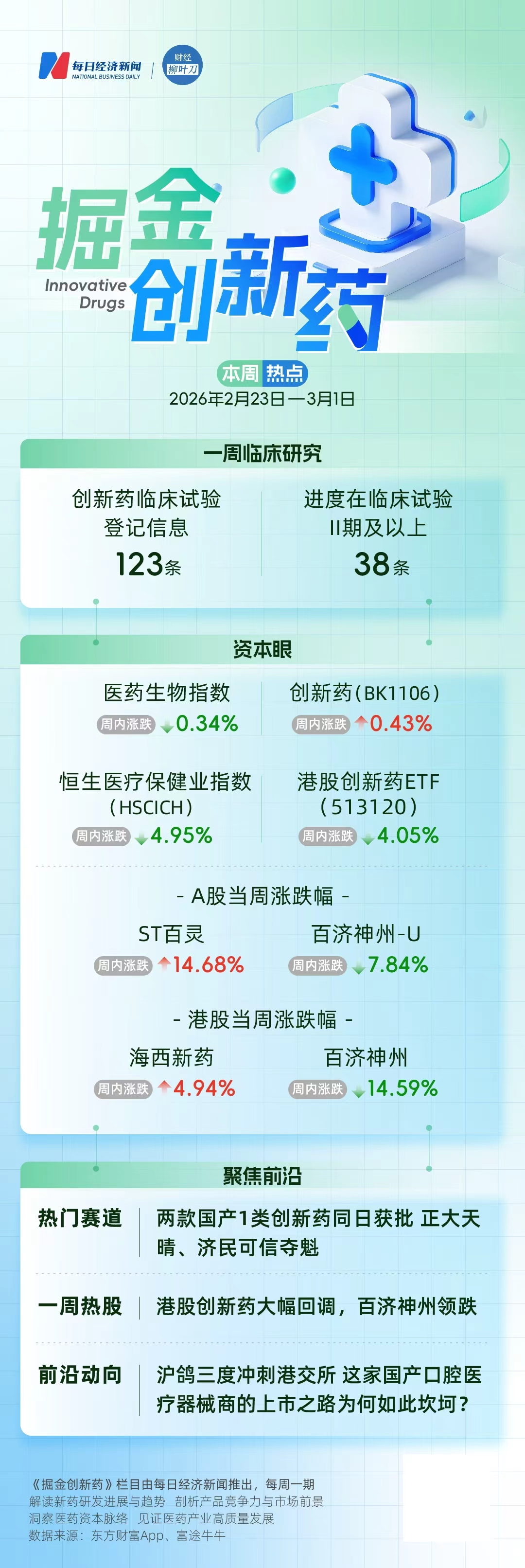 根据医药魔方提供的数据,2月23日至3月1日,国家药品监督管理局药品审评中心共披露123条临床试验登记信息,其中38条为处于临床试验II期及以上的创新药新登记临床试验信息,3个临床研究项目正在招募患者。