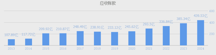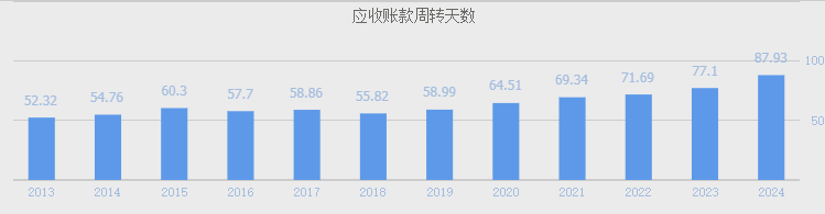2024年公司应收账款440亿占总资产23.8%(1850亿),应收账款占总资产比例不低,较去年同期385亿同比增长14.3%,应收账款的增长,使得应收账款周转天数87.93天较去年同期77.1天增加10天,近几年公司应收账款周转天数呈逐年增加,且毛利率逐年下降,表明公司对下游客户的议价权不断下降。