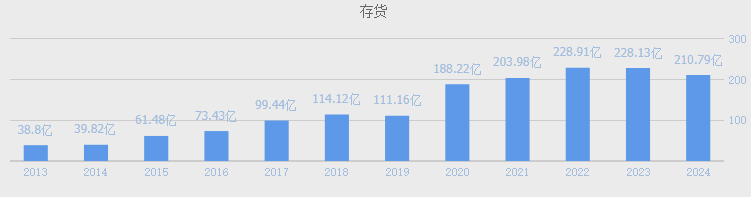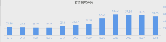 2024年公司存货210.8亿占总资产11.4%(1850亿),存货占总资产比例不低,较去年同期228亿同比下降8%,使得存货周转天数53.25天较去年同期56.29天下降3天,公司的存货管理效率有所提升。公司存货主要有原材料、