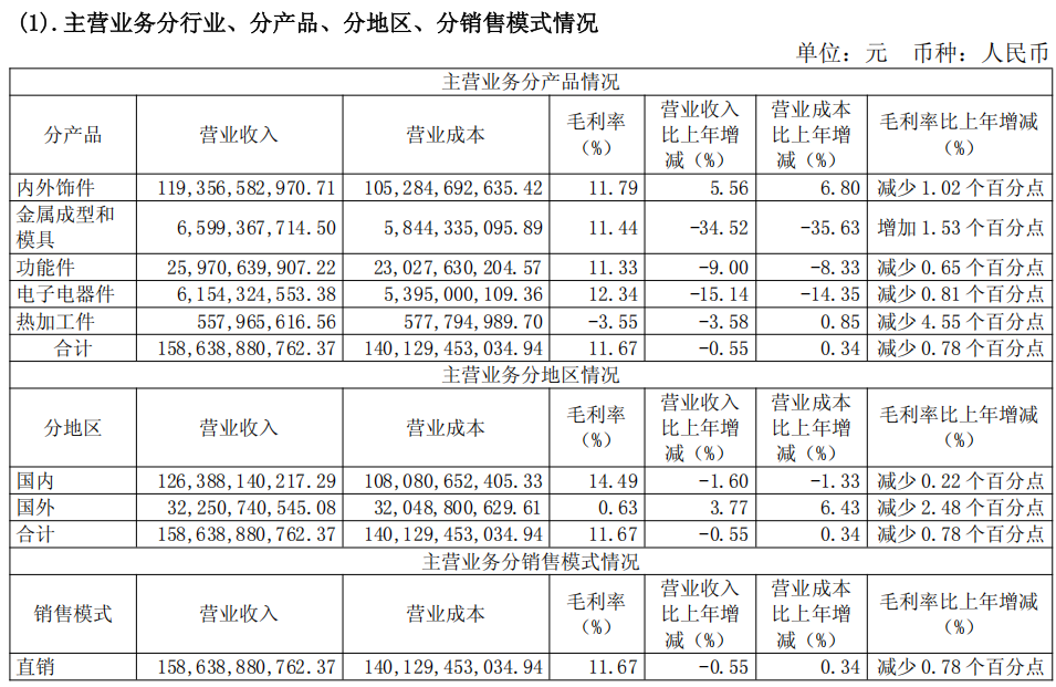 2024年公司第一大主营内外饰件营收1193.6亿元同比增长5.56%,毛利率11.79%较去年同期同比下降1.02%;其余产品营收都以下降为主。