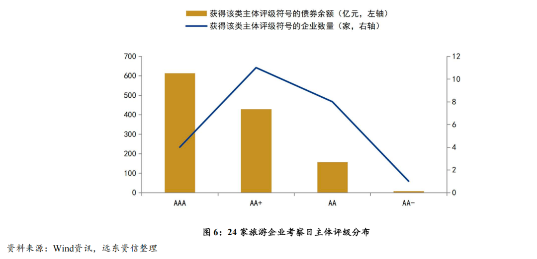 截至考察日,24家发债样本企业的主体信用级别分布如图6所示。以企业数量统计,其主体评级以AA+为级别中枢,获得AA(含)以上评级的企业23家,占比95.83%,中国旅游集团有限公司、黄山旅游集团有限公司、锦江国际(集团)有限公司、北京首都旅游集团有限责任公司拥有AAA主体评级。以企业的债券余额统计,主体评级为AAA的企业债券余额占比(50.85%)较大,其次为AA+级企业(32.05%)。