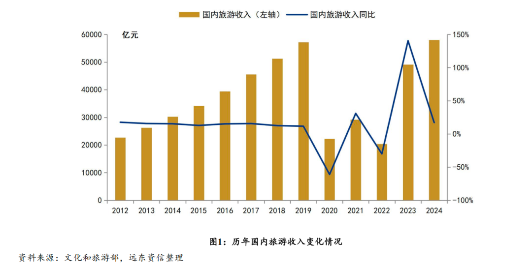 2009年全球金融危机复苏以来截至2019年,中国国内旅游收入随同国民经济增长、居民收入增长和消费结构升级以及旅游业政策支持、基础设施状况改善而呈现持续较快增长态势,从2009年的1.29万亿元增至2019年的6.63万亿元,年均复合增长约18%。2020年至2022年受到疫情因素影响,国内旅游业收入显著下滑。2023年以来,受惠于扩大消费政策刺激、居民旅游消费需求潜力释放、旅游供给端推陈出新等诸方面因素,我国旅游业恢复疫情之前的快速增长态势。其中,2024年国内旅游收入达到5.8万亿元,同比增长17%。2025年上半年,国内居民出游花费达到3.15万亿元,同比增长15.2%。