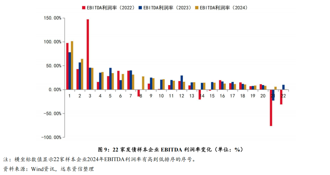 从发债样本企业个体盈利能力变化来看,图9显示,22家样本企业2023年以来的EBITDA利润率变化大致以平稳和持续增长的居多,近年样本企业个体的EBITDA利润率状况有所分化。重庆市武隆喀斯特旅游产业集团、浙江舟山旅游集团、南京牛首山文化旅游集团、黄山旅游集团2024年EBITDA利润率较高,分别为101.34%、64.44%、45.52%、36.77%;云南世博旅游控股集团、重庆文化旅游集团2024年EBITDA利润率相对上年由负转正,盈利状况改善显著。