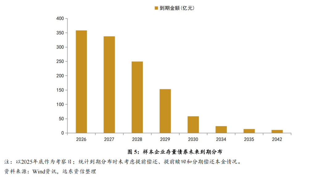从存量债券到期情况来看,图5显示,假定不考虑考察日之后,发债样本企业新发行债券的到期(含提前到期)情况,2026年和2027年将是发债样本企业偿债高峰年,债券到期金额将达358.15亿元和337.79亿元。随后各年,发债样本企业的2025年底存量债券的到期压力将逐年显著减轻。
