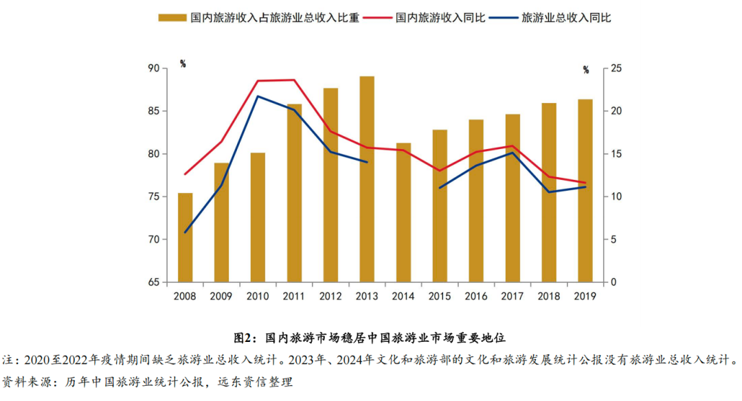 国内旅游长期成为我国旅游业的核心组成部分。图2显示,2011年以来,国内旅游收入占旅游业总收入比重一直处于80%以上水平,其收入增速快于旅游业整体收入增速,国内旅游板块是引领中国旅游业增长的核心动力。