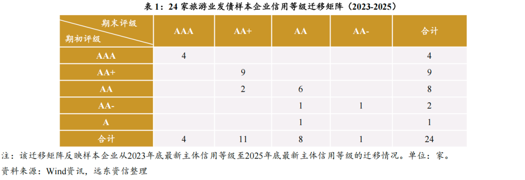 本文选取2023年底截至2025年底作为发债样本企业主体评级迁移分析的考察期。考察期内,市场对24家发债样本企业的主体评级之中,20家等级维持稳定,稳定率为83.33%,其中,19家稳定为AA(含)以上的主体评级。考察期内,江西省旅游集团、南京牛首山文化旅游集团、南京商贸旅游股份有限公司、苏州高新旅游产业集团有限共计4家企业的主体信用等级上调,因此24家发债样本企业的上调率为16.67%。从评级展望来看,截至考察日,市场对24家发债主体的给出的评级展望均为稳定。
