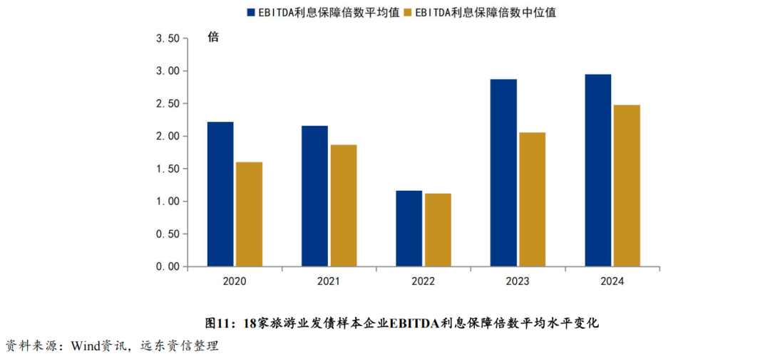 从财务状况看:经营规模方面,受惠于2023年以来全国旅游市场快速复苏的环境,2023年样本企业营收整体快增,2024年则基本保持平稳。盈利能力方面,2023年以来样本企业EBITDA利润率平均水平趋于增长。财务杠杆方面,样本企业债务杠杆总体适中稳健。偿债能力方面,2023年18家企业EBITDA利息保障倍数平均水平较上年显著改善,2024年维持增长态势。