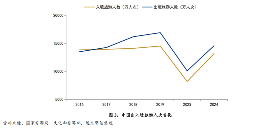受惠于扩大消费的政策刺激、居民旅游消费需求潜力释放、旅游供给端推陈出新等诸因素,我国旅游业自2023年以来恢复新冠疫情前的快速增长态势。国内旅游、出入境旅游市场均快速反弹,尤其入境旅游市场增长显著。