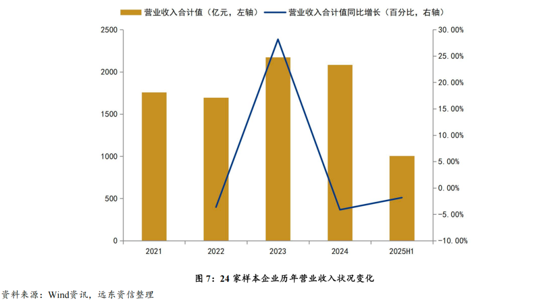 图7显示,2023年受惠于全国旅游市场经济整体快速复苏的利好环境影响,24家发债样本企业营业收入整体迅速增长,同比增速达到28.17%。2024年以来,其营业收入合计值则大致平稳,稳中缓降——2024年营收合计值同比增长-4.13%,2025年上半年营收合计值则同比增长-1.84%。