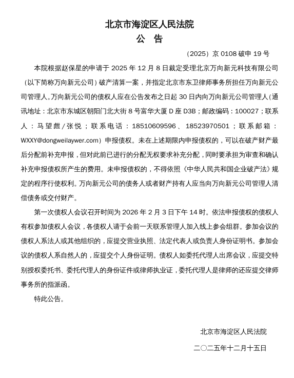 2025年12月8日,北京市海淀区人民法院裁定受理北京万向新元破产清算一案。原因是北京万向新元未能完全清偿到期债务,被债权人赵保星申请破产清算。