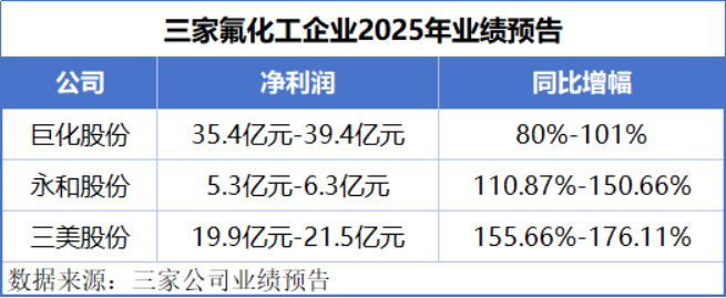 一边是,氟化工板块在2025年交出一份完美的成绩单!根据业绩预告,巨化股份、永和股份、三美股份等企业在2025年实现净利润大幅增长。