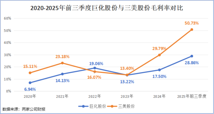 2025年前三季度,巨化股份的毛利率为28.86%,明显低于三美股份的50.73%。