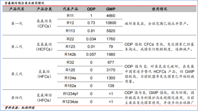 根据ODP值(消耗臭氧潜能值)和GWP值(全球升温潜能值)进行环保程度评估,氟制冷剂经历了四代迭代。