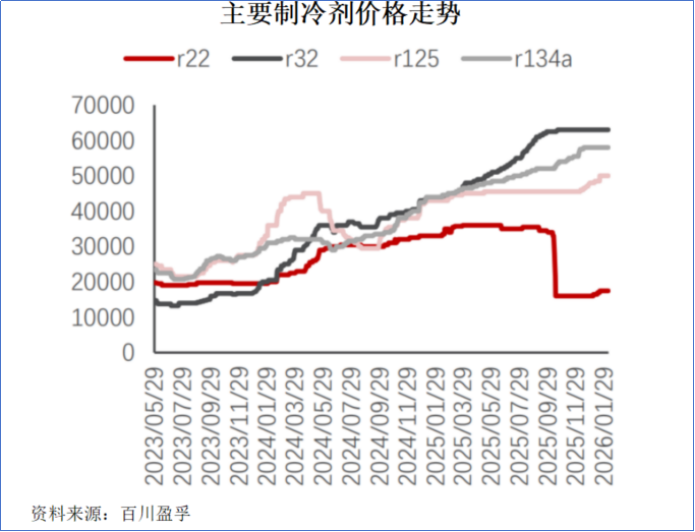 截至2026年1月末,R32、R125、R134a等三代制冷剂的市场报价分别上升至63000元/吨、51000元/吨、57000元/吨左右。