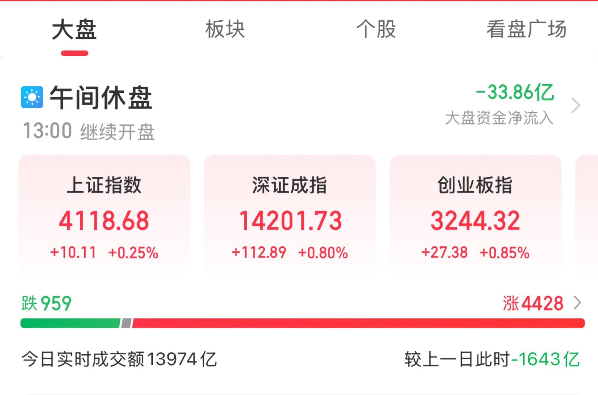 A股三大指数早盘集体上涨,截至午盘,沪指涨0.25%,深成指涨0.8%,创业板指涨0.85%,北证50指数涨0.4%,沪深京三市半日成交额13974亿元,较上日缩量1643亿元。全市场超4400只个股上涨。
