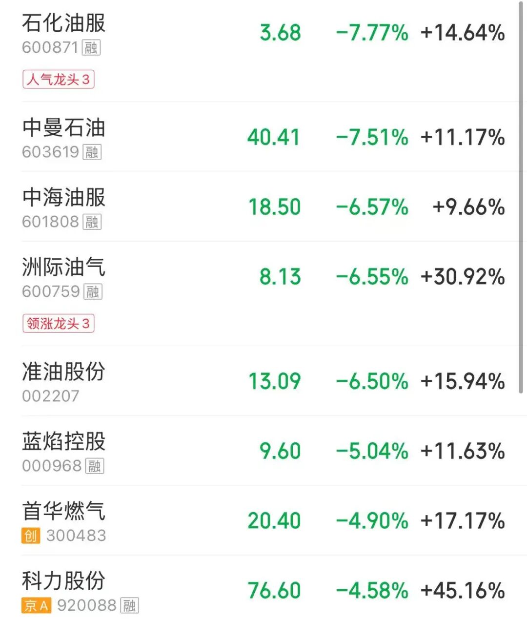 下跌方面,油气股表现疲软,石化油服、中曼石油大跌。