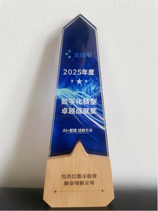 近日,恒丰纸业凭借在数智化转型升级赛道的深耕实践与系列创新突破,成功斩获由国内市场占有率稳居第一、全球知名的企业管理云SaaS龙头企业——金蝶颁发的“2025 年度数字化转型卓越成就奖”。这份荣誉,既是行业领军平台对恒丰纸业数字化转型建设成果的高度认可,更是对企业长期深耕数智化模式创新、以数字技术赋能高质量发展的权威肯定。
