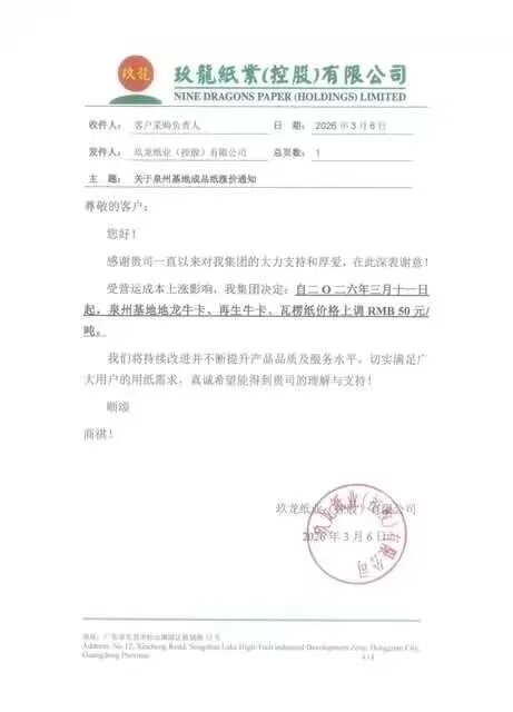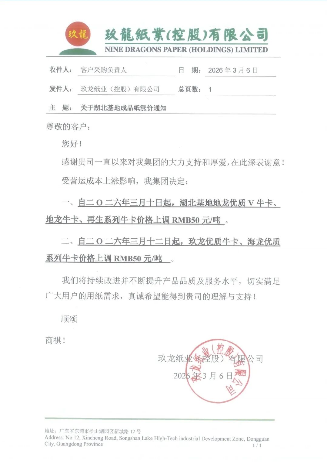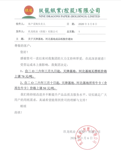 自三月十一日起,泉州基地地龙牛卡,再生牛卡、瓦楞纸价格上调RMB 50元/吨。
