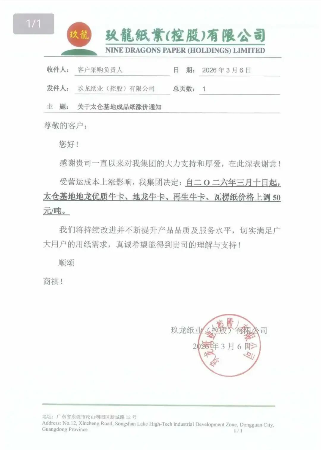 自三月十日起,太仓基地地龙优质牛卡、地龙牛卡、再生牛卡、瓦楞纸价格上调50元/吨。