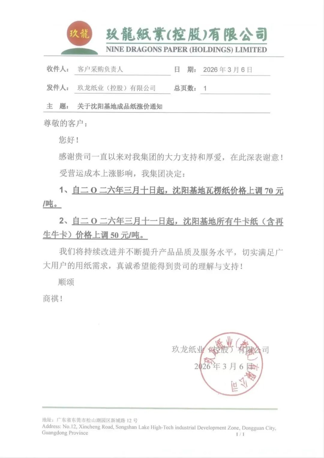2、自三月十一日起,沈阳基地所有牛卡纸(含再生牛卡)价格上调50元/吨。