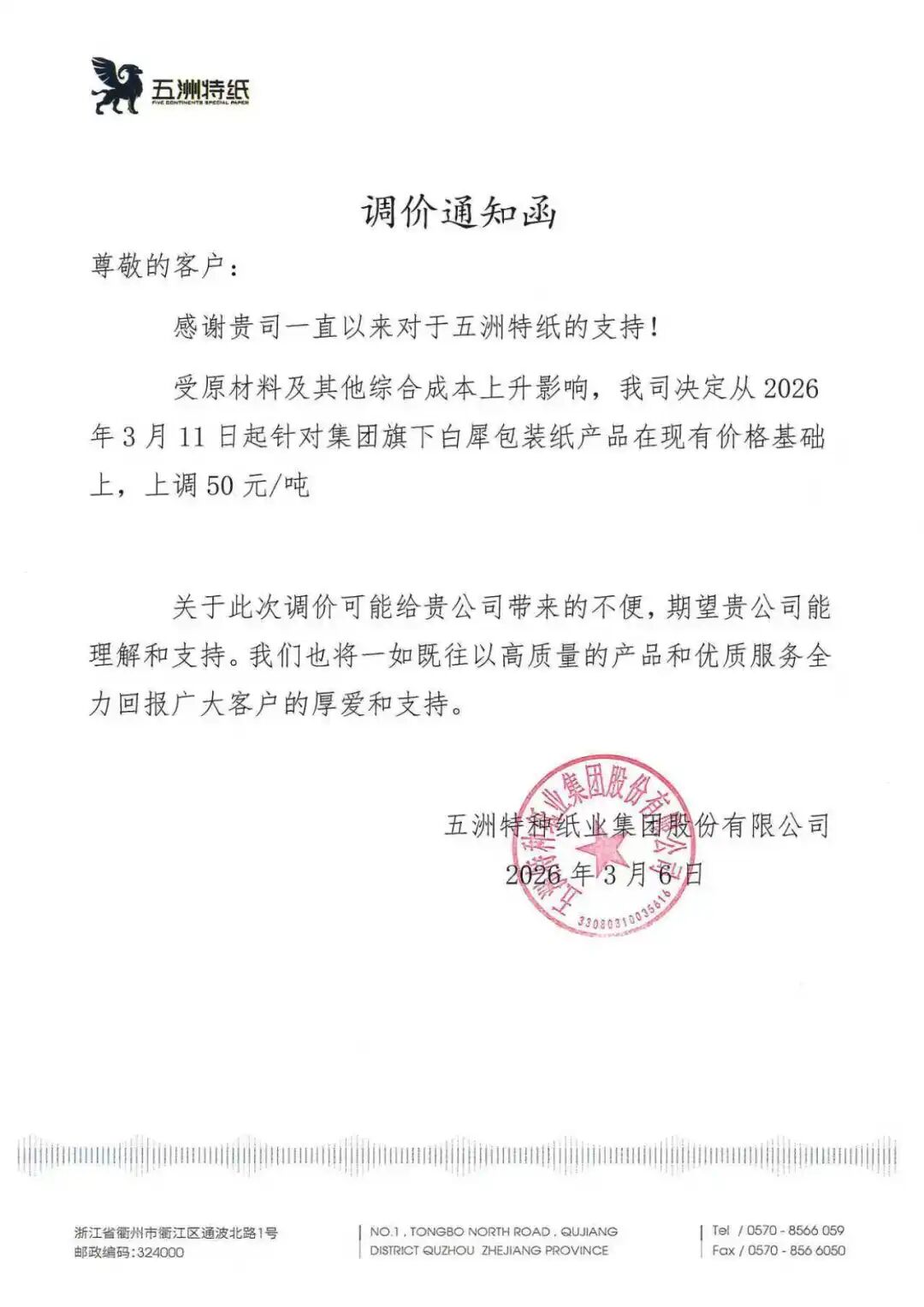 从3月11日起,针对集团旗下白犀包装纸产品在现有价格基础上,上调50元/吨。