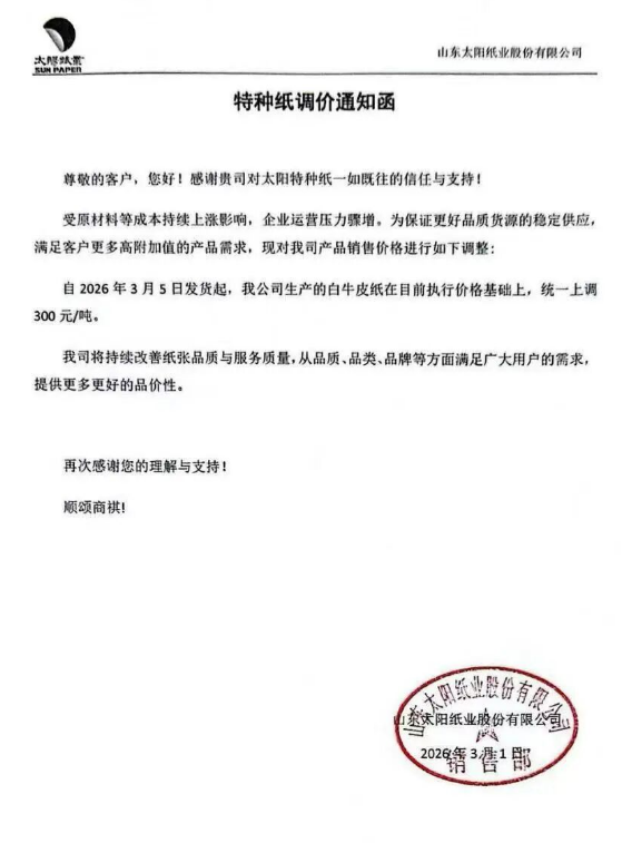 此外,近期多家纸企也集中上调白牛皮纸类产品价格。其中,太阳纸业、五洲特纸均计划自3月5日起,对旗下白牛皮纸产品价格在目前执行价格基础上,统一提价300元/吨。