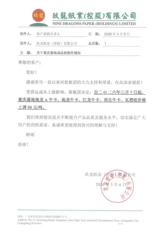 自三月十日起,重庆基地地龙A牛卡、地龙牛卡、江龙牛卡、再生牛卡、瓦楞纸价格上调50元/吨。