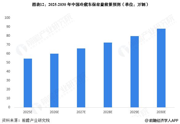 随着我国冷链物流市场整体规模的逐年增长,公路冷链物流市场规模也随之增长并且因为公路运输的便捷性,未来公路冷链运输仍将是冷链运输的主流方式。根据中物联冷链委的冷藏车历年销量数据,假定现有的销量规模不变,按照15年强制报废年限测算,到2030年,冷藏车保有量有望达到88万辆。
