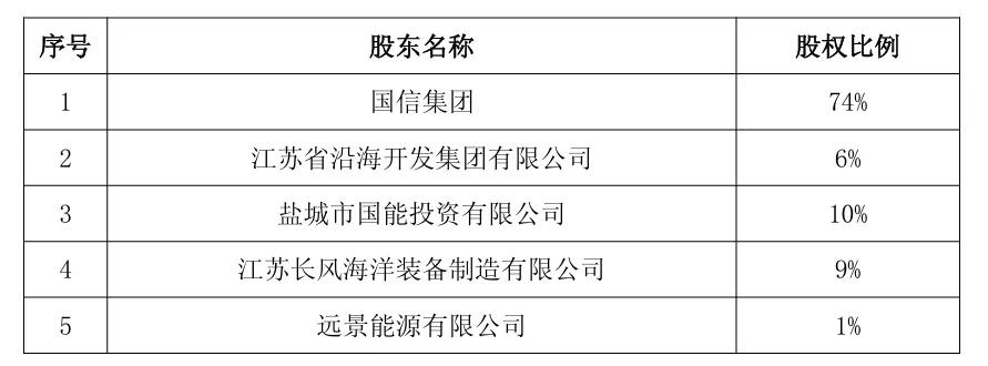 国信集团拟与江苏省沿海开发集团有限公司、盐城市国能投资有限公司、江苏长风海洋装备制造有限公司、远景能源有限公司按照74%:6%:10%:9%:1%的股权比例共同出资成立项目公司,作为射阳项目的实施主体。