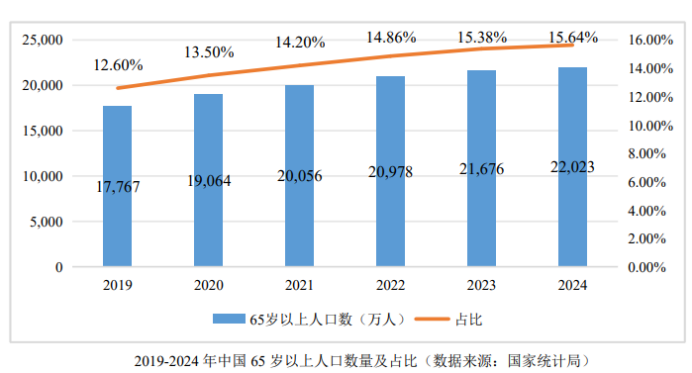 公司的这一产品,对应的正是日趋老龄化,以及失眠的年轻化。数据显示,2024年我国65岁及以上人口已超2.2亿人,同比增长1.6%,占总人口比重也攀升到了15.64%,伴随的就是慢性病发病率呈现上升态势。