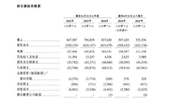从业务规模来看,优乐赛共享近年来保持一定增长。公司收入在2022年为人民币6.476亿元,2023年升至7.94亿元,2024年达到8.376亿元;同期净利润分别为3120万元、6410万元和5070万元。截至2025年8月31日止八个月,公司实现收入5.3亿元,净利润2690万元。