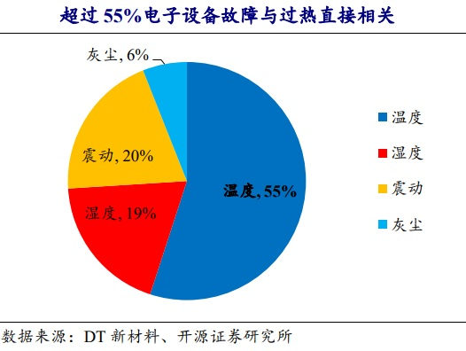 随着AI大模型快速迭代与算力芯片向高集成、高功率方向演进,热管理已成为制约芯片性能释放的核心瓶颈。中邮证券曾在研报指出,电子元器件的可靠性对温度十分敏感,当电子元器件的工作温度达到70-80℃后,温度每上升1℃,其可靠性就会降低5%。而开源证券研报则表示,超过55%的电子设备失效的主要原因是温度过高。