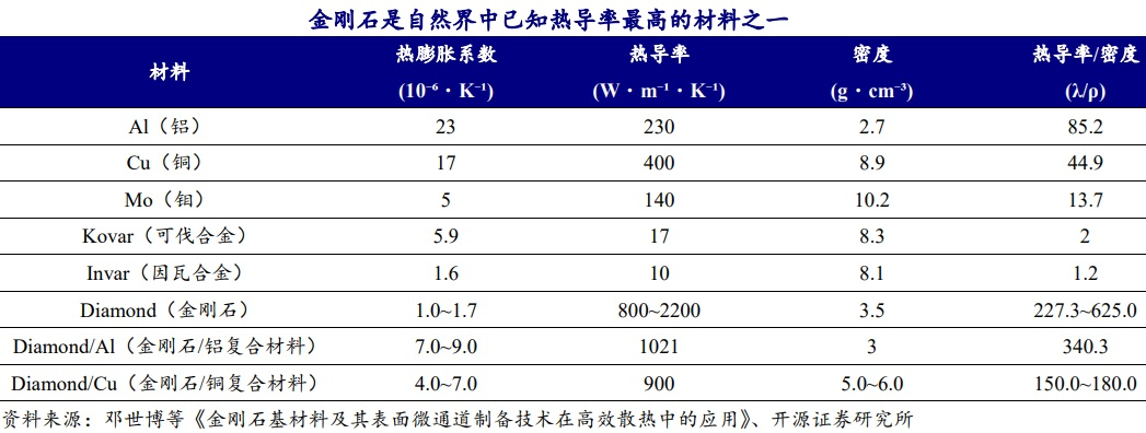 开源证券认为,当下AI芯片功耗快速跃升,单GPU功率密度突破2000W,热点热流密度突破1000W/cm²,传统散热体系逐步触及物理极限,难以匹配高功率算力芯片的热管理需求,发展新一代高导热材料迫在眉睫。凭借最高2200W/m·K的超高热导率、低热膨胀系数及优异热导率/密度比,金刚石散热有望成为高算力时代的“终极”散热解决方案,解锁AI算力深层潜力。和当前主流散热材料纯铜、纯铝相比,金刚石热导率的上限值是前者的5.5倍,是后者的9.6倍。