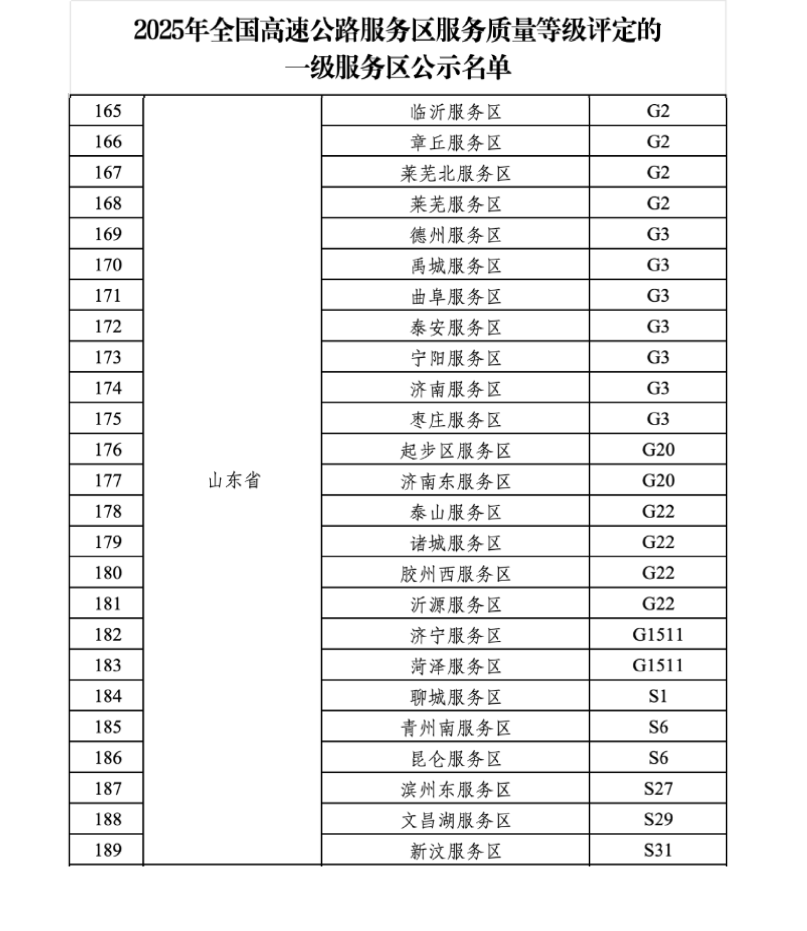 青岛日报社/观海新闻3月11日讯 近日,交通运输部公示2025年全国高速公路服务区服务质量等级评定一级服务区名单,包括青兰高速胶州西服务区在内的山东高速集团所辖25对服务区成功上榜。