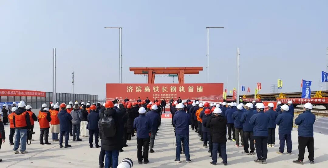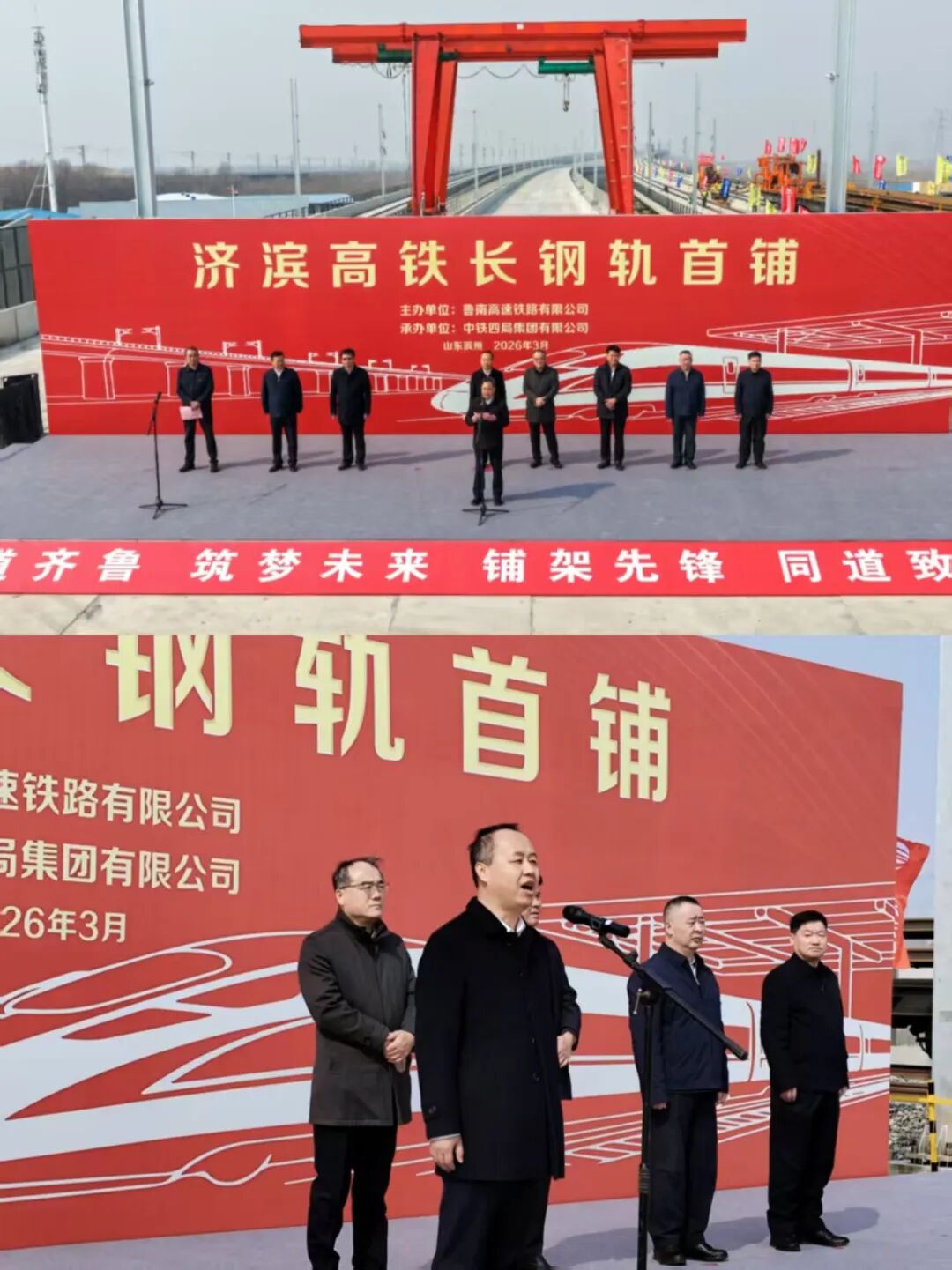 3月10日,济滨高铁滨州站建设现场,山东铁投集团党委书记、董事长王卫中宣布济滨高铁首列长钢轨正式开铺,标志着项目建设进入冲刺阶段,距离通车更进一步。山东铁投集团权属鲁南高铁公司党委副书记、总经理李翔鹏主持首铺仪式;中铁四局集团党委副书记、总经理杨辉;山东铁投集团党委委员、副总经理,鲁南高铁公司党委书记、董事长杨俊泉;滨州市副市长、市政府党组成员吕明涛先后致辞,施工单位作“保安全、保质量、保工期” 宣誓并汇报现场准备情况。