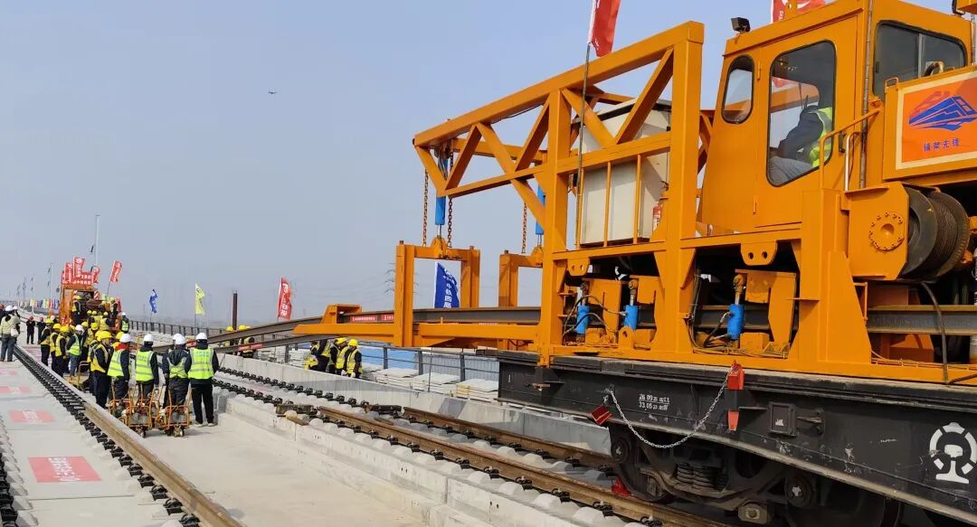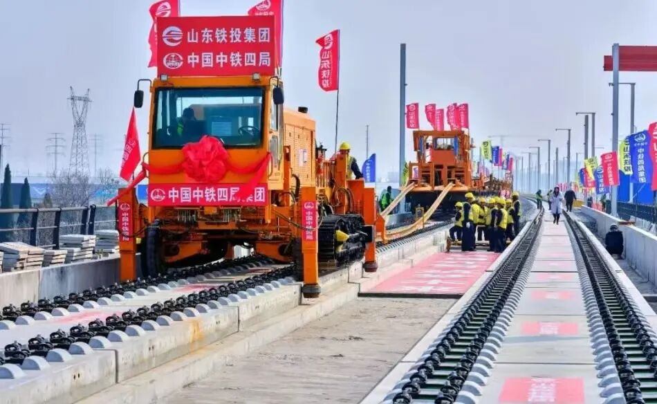 由山东铁投集团建设的济滨高铁是津潍高铁及山东省快速铁路网鲁北通道的重要组成部分。项目启动以来,聚力高效推进。为保障铺轨作业高质高效推进,鲁南高铁公司会同中铁四局精心组织、科学管理,投入运输、铺轨、牵引等全套专业化机械设备共计百余台,施工效率全面提升。其中,WZ500无砟铺轨机组单班日铺轨可达6公里,YWQY100型牵引车集成履带、轮胎和轮轨走行装置,可无缝切换有砟、无砟轨道铺设模式,确保各类线路作业连续、精准、高效。