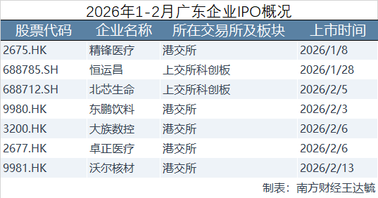 南方财经记者查询Wind数据显示,今年1-2月全国共有44家企业在A股与H股成功上市,其中广东占据7席,排名前列。