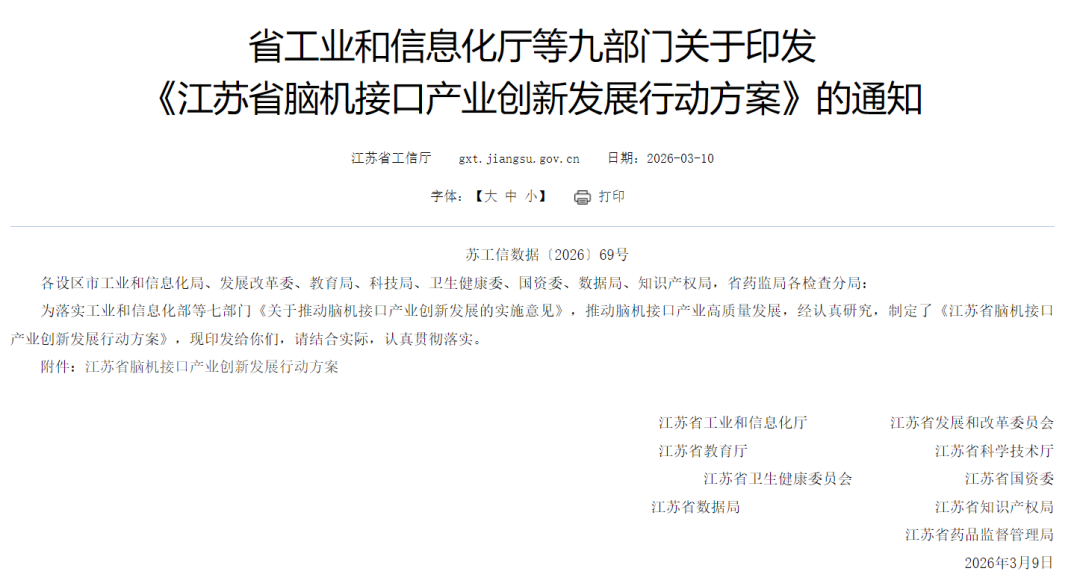3月10日,江苏省工信厅等四部门联合印发《江苏省脑机接口产业创新发展行动方案》(以下简称《方案》),明确提出"到2027年推动一批医疗器械完成注册审批,建设2个以上省级产业集聚区;到2030年打造2-3家领军企业,形成完整产业生态"的目标。这是继2026年政府工作报告将脑机接口列为"未来产业"后,地方层面落地的首个系统性产业规划,标志着该赛道正式进入"政策+资本+技术"协同发力的黄金期。