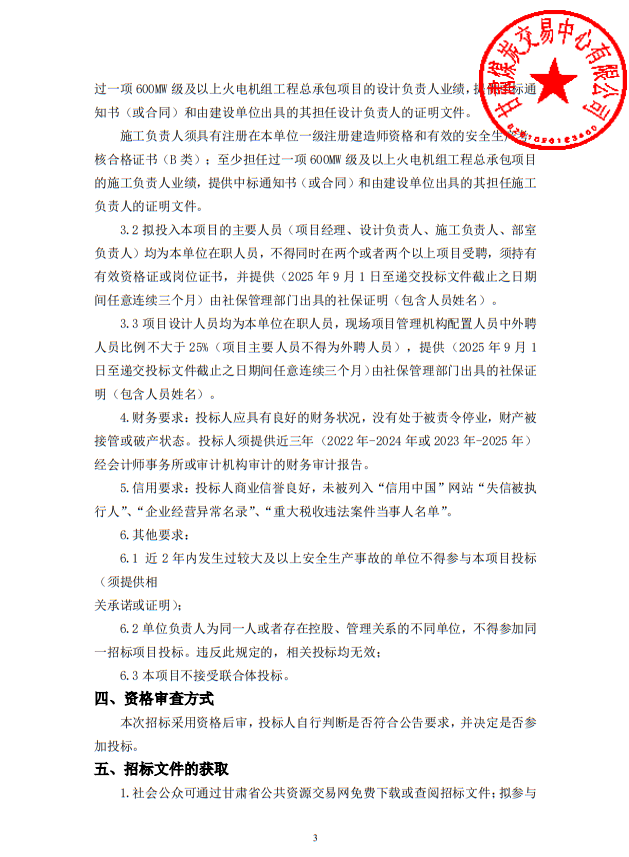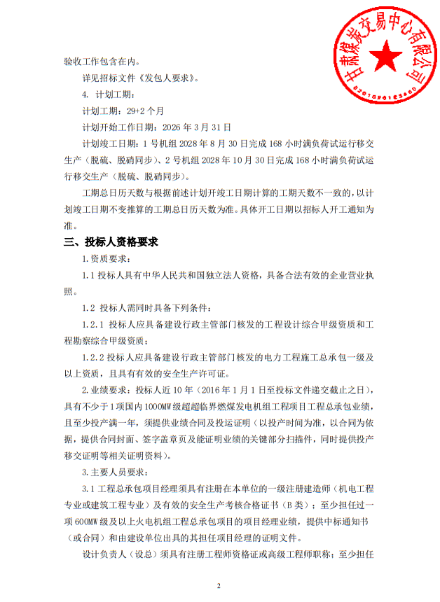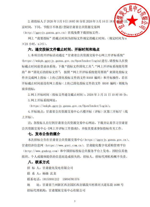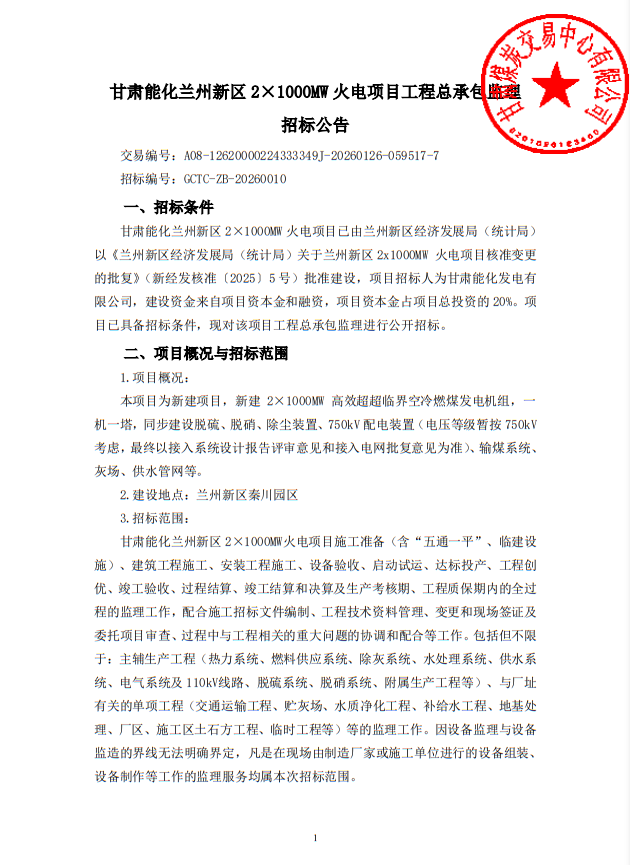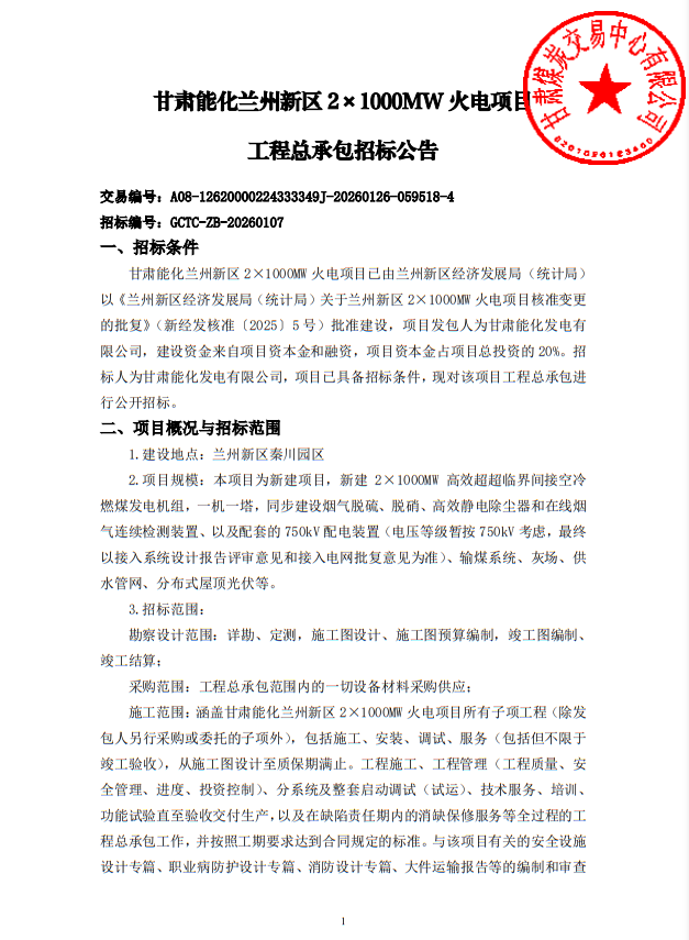 3月9日,甘肃省公共资源交易中心发布甘肃能化兰州新区2×1000MW火电项目工程总承包、监理项目招标公告,详情如下: