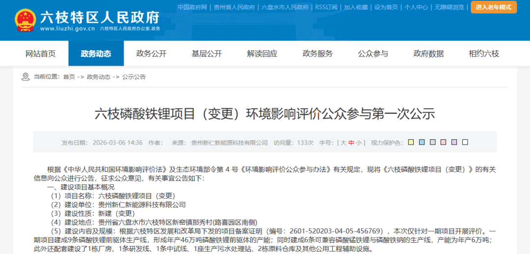 起点锂电注意到,3月6日,贵州六盘水一磷酸铁锂相关大项目进行环评公示,意味着贵州地区磷酸铁锂产能将进一步扩充。