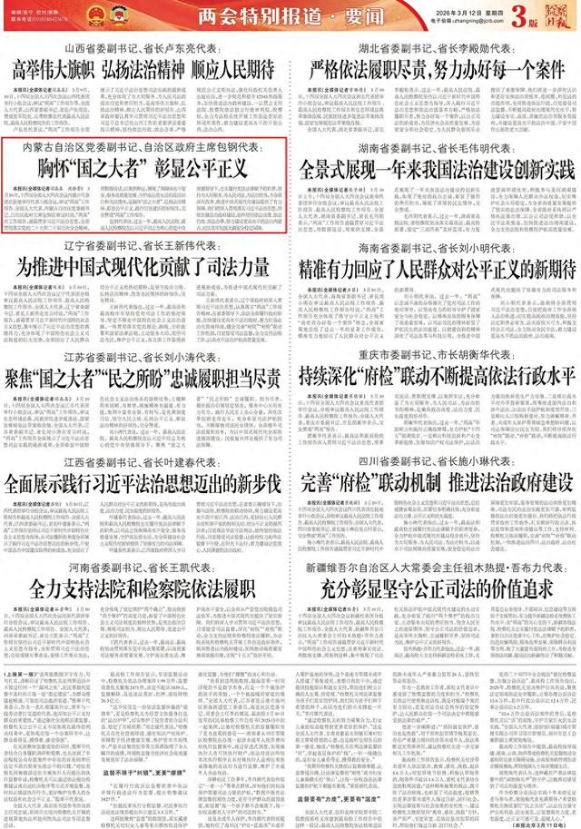 3月12日,《检察日报》第3版刊发《内蒙古自治区党委副书记、自治区政府主席包钢代表:胸怀“国之大者” 彰显公平正义 》的文章。