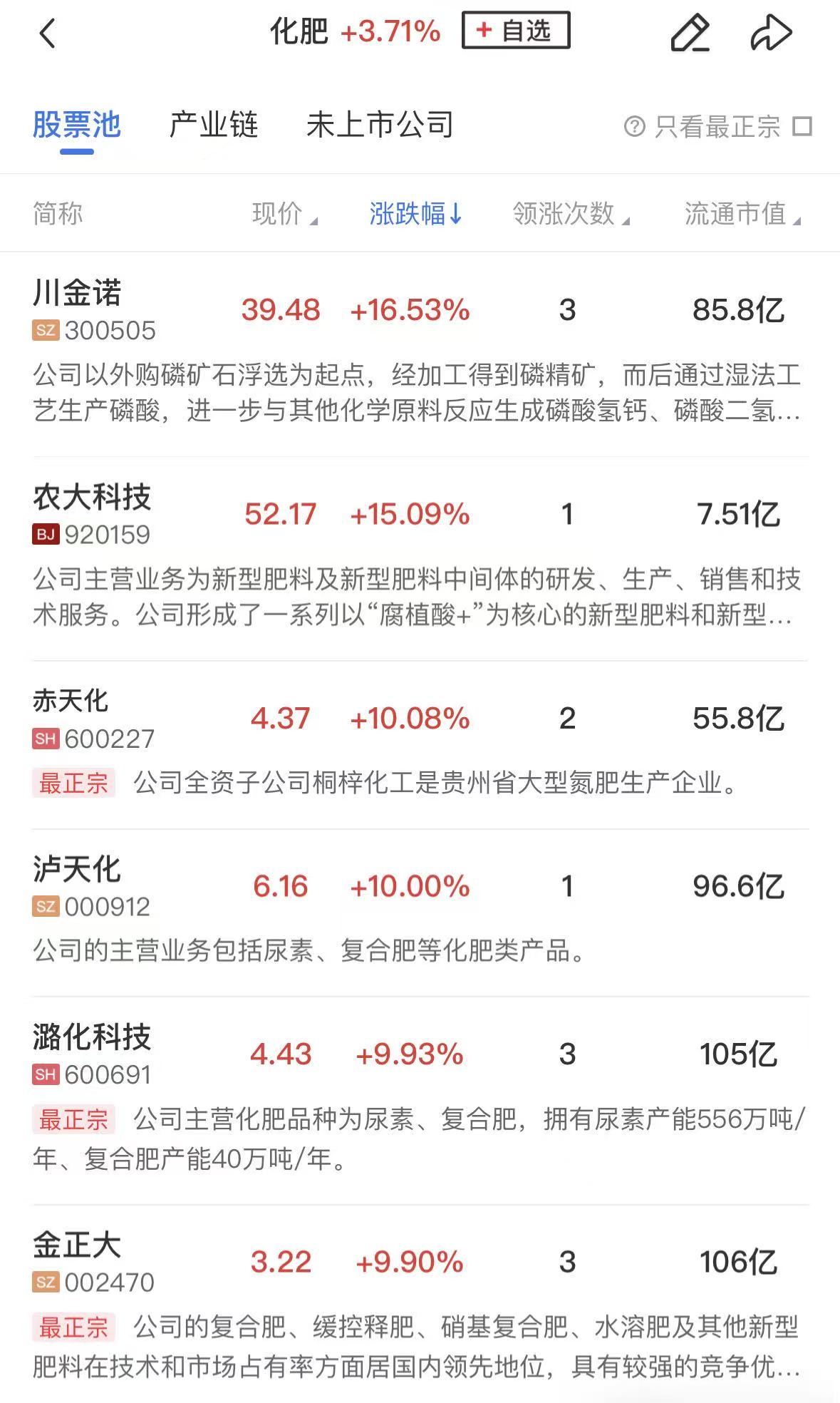 化工板块延续强势,磷化工、化肥方向领涨,赤天化、泸天化、潞化科技、金正大、澄星股份涨停,富邦科技、东方铁塔、